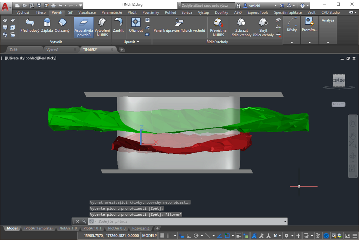 Let's have a two sets of point coordinates, describing the existing (old) and planned (new) terrain surface. First you will need to create a 3D surface from these points. Again, just a snap in AutoCAD Civil 3D; but in plain AutoCAD you will need an add-on tool - e.g. the DTM freeware LISP utility by CAD Studio (ARKANCE) (see also the Tip 5934). Its command DTM will help you make the TIN surfaces (3DFACES) from the individual point sets - here the random (DTMRND command) green and red surfaces (colored manually, recommended to put into separate layers for easier selection):