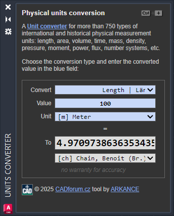 Paleta zpřístupňuje interaktivní online převodník jednotek z webu www.cadforum.cz/cadforum_en/units.asp přímo v prostředí AutoCADu. Paletu zobrazíte funkcí CONVERTUNITS nebo ikonou "Convert Units" v ribbonu Doplňky (Add-ins).