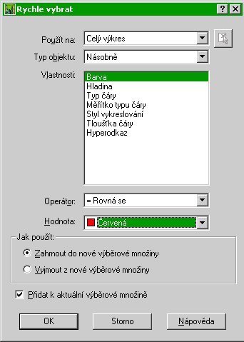 Příkaz umožňuje rychlý způsob vybírání objektů podle jejich vlastností. Můžeme vybrat např. všechny kružnice, všechny červené oblouky, všechny tečkované úsečky, všechny objekty v určité hladině ap.