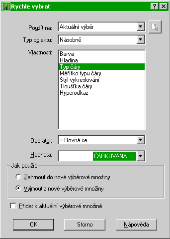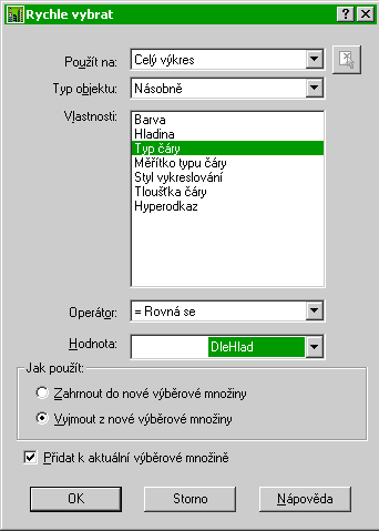K aktuálnímu výběru přidáme (Přidat k aktuální výběrové množině) všechny objekty výkresu (Použít na: Celý výkres) kromě těch, které mají typ čáry DleHlad (Typ objektu: Násobně, Vlastnosti: Typ čáry, =Rovná se, Hodnota: DleHlad, Vyjmout z nové výběrové množiny). |