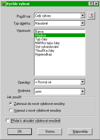 Výběr všech objektů (Typ objektu: Násobně) z celého výkresu (Použít na: Celý výkres), které leží v hladině pom (Vlastnosti: Hladina, Operátor: =Rovná se, Hodnota: pom). |