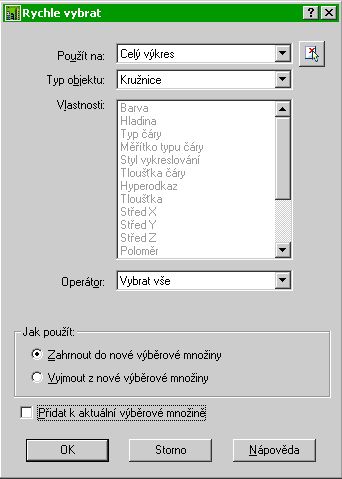 | Výběr všech kružnic (Typ objektu: Kružnice) z celého výkresu (Použít na: Celý výkres) nezávisle na jejich vlastnostech (Operátor: Vybrat vše). |