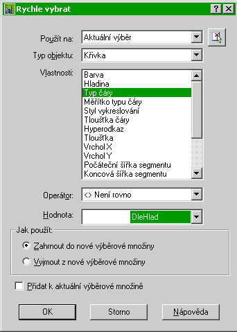 | Výběr všech křivek (Typ objektu: Křivka) z aktuálního výběru (Použít na: Aktuální výběr), které mají jiný typ čáry než DleHlad (Vlastnosti: Typ čáry, Operátor: <> Není rovno, Hodnota: DleHlad). |