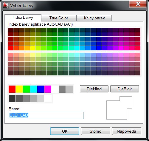 Nově kreslený objekt má aktuální barvu. Nastavení aktuální kreslící barvy – – vidíme na panelu nástrojů „Vlastnosti objektu“ [Object Properties], který je standardně zobrazen v horní části okna. Výchozí barvou je logická barva „DleHlad“ [ByLayer], tj. objekt je vykreslen barvou, která je přiřazena jeho hladině. Ještě existuje jedna logická barva – „DleBlok“ [ByBlock]. Pokud dáváme objektu jinou barvu, než má hladina, ve které leží, pak volíme ze sedmi základních barev, které jsou i pojmenované (červená, žlutá, zelená, světle modrá, modrá, fialová, bílá/černá) [red, yellow, green, cyan, blue, magenta, white/black], nebo „Vybereme barvu“ jinou – kteroukoli z dalších barev podle tabulky barev.