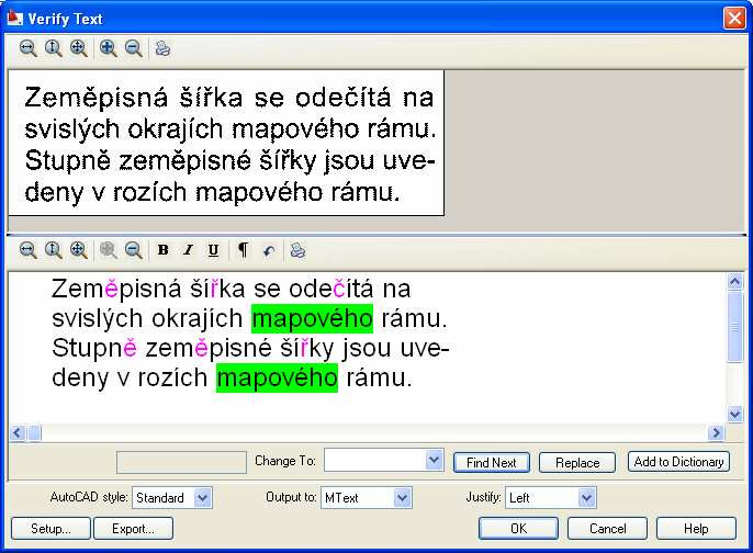 - Neznámé slovo "mapového", které je zvýrazněno zeleně,můžete zařadit do slovníku volbou Add to Dictionary.Příště toto slovo již bude rozpoznáno jako známe slovo.