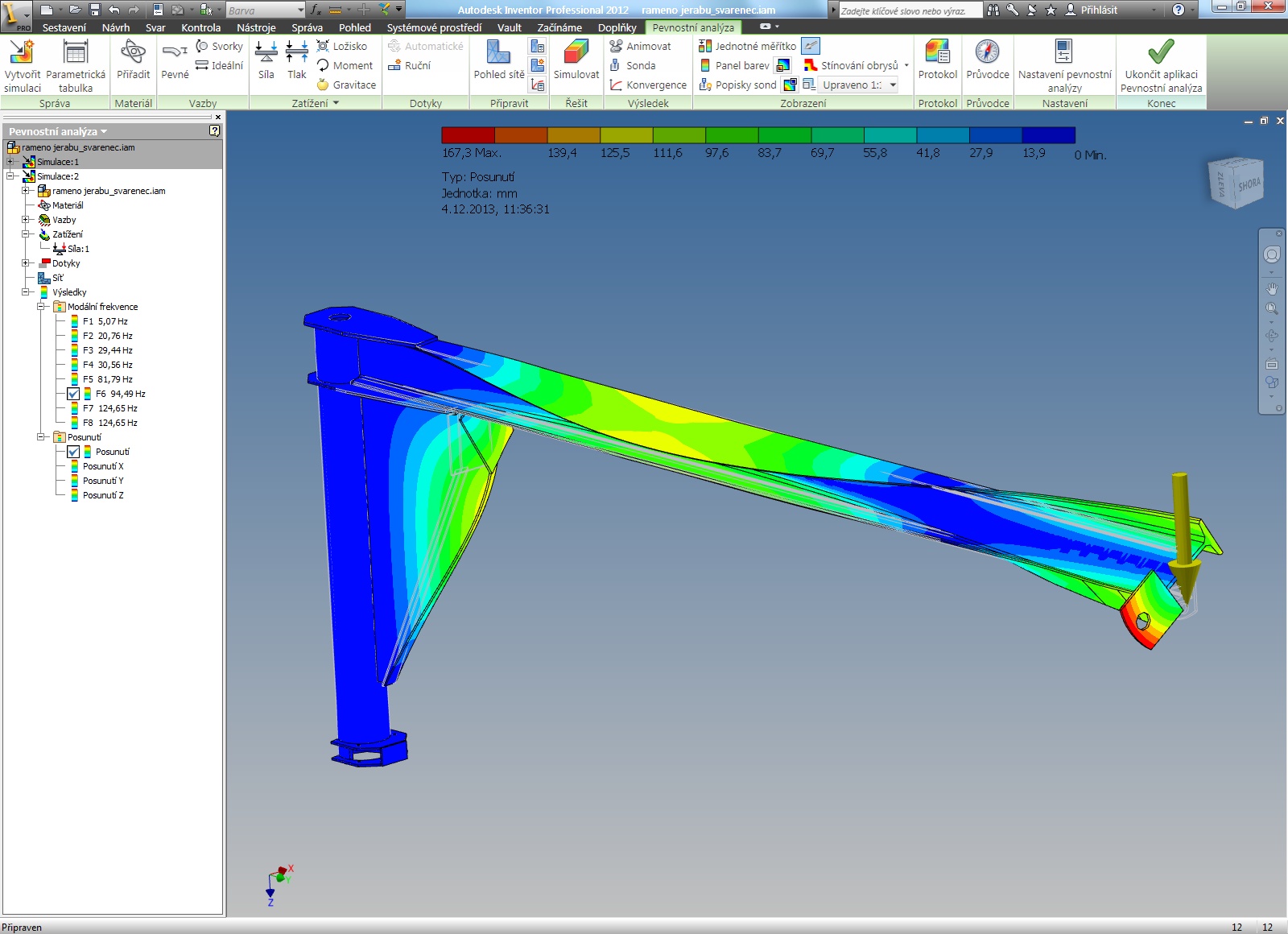 Dám konkrétnější příklad: Zkoušel jsem udělat modální analýzu ramena jeřábu a vyšlo mi několik vlastních frekvencí. Výsledek je na přiloženém obrázku. Když se na něj podíváte, uvidíte vypočítanou deformaci 167mm, což mi můj strojařský cit nějak odmítá přijmout. Tak jak si to mám zdůvodnit? Buďto jsem vůbec nepochopil, co počítač vlastně vypočítal nebo vypočítal nějakou blbost nebo mě můj selský rozum zrazuje. Tak takhle jsem myslel to, jak správně interpretovat výsledky výpočtu.