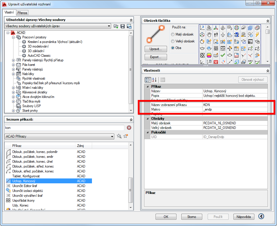 Ale to "KON"nebo "_END" není příkaz. Je to již odezva v příkazu (nastavení módu uchopení). V souboru "acad.pgp" můžete na každém řádku zadat zkratku jednoho příkazu. Pokud chcete složitější konstrukci, použijte makro nebo lisp.