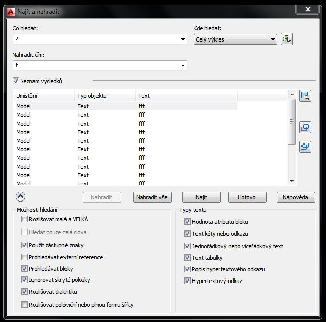 No mně se to právě takto nedaří. Když chci tedy např. nahradit jen první znak a dám najít "?", tak mně to nahradí všechny znaky za požadovaný znak. Nevím, jak ACAD LT donutit, aby nahradil pouze jen ten první znak, anebo přidal něco před stávající řetězec.