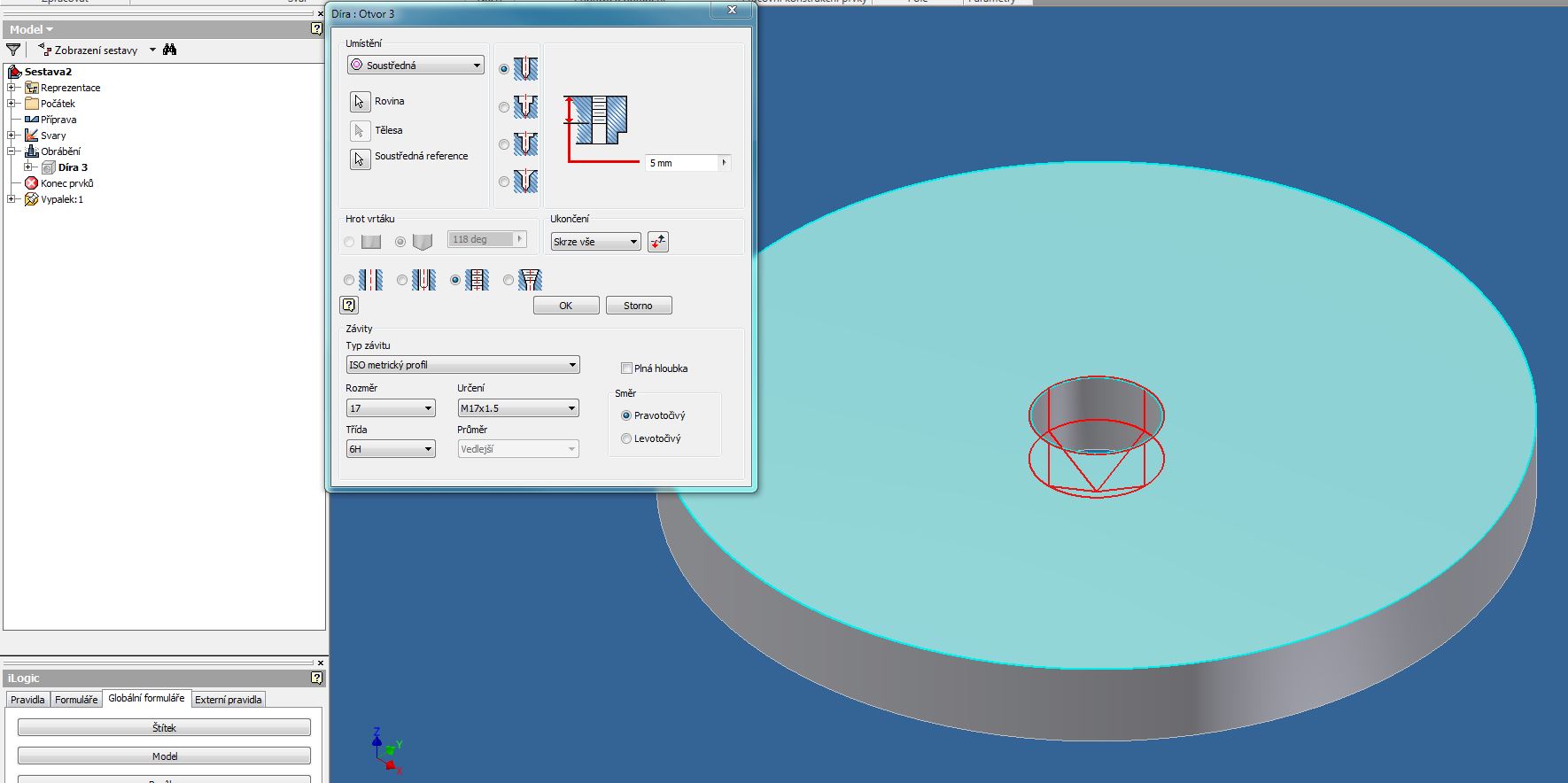 svařenci vyberte "obrábění" a pomocí příkazu "díra" vytvoříte závit.