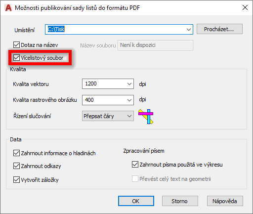 1) To vím, že můžu v možnostech pro publikování do pdf zvolit možnost "vícelistový soubor". Ale pak když cokoliv publikuji (tisknu do pdf), tak se vytváří pdf s názvem sady listů, což není praktické. Kdyby název souboru pdf vytvářel např. podle názvu podsady, tak by to bylo lepší, ale tak to asi nefunguje.Zatím se mi zdá jednodušší tisknout ze sady listů jednotlivé listy, a pdf jsou pojmenované podle názvu listu a když mám ve výkrese více listů, tak to tisknout přímo z výkresu označením všech záložek rozvržení, které chci mít v jednom pdf a to publikovat.