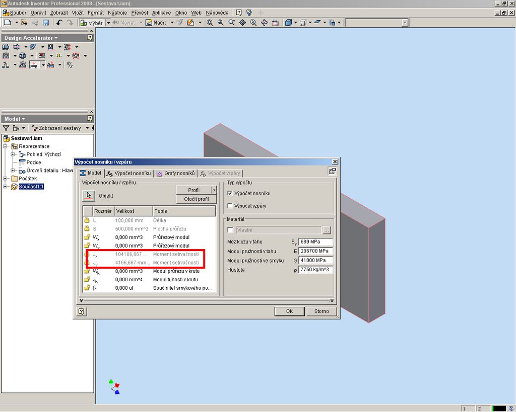 Hledám kvadratický moment průřezu, někdy též označovaný jako plošný moment setrvačnosti. Jak napsal pan Pápay, je možné tuto průřezovou charakteristiku získat při výpočtu nosníku v Design Acceleratoru, ovšem jen v prostředí sestavy.